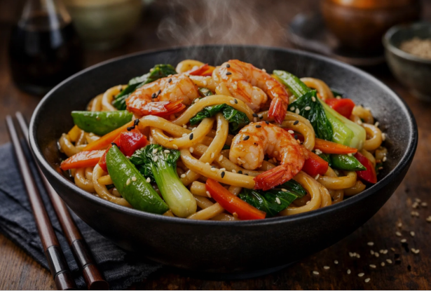This dish is especially popular among busy families because it takes less than thirty minutes to cook, yet tastes like something from a restaurant. The thick udon noodles soak up the sauce beautifully, while prawns add natural sweetness and protein. Vegetables bring freshness and color, making the dish both nutritious and comforting.